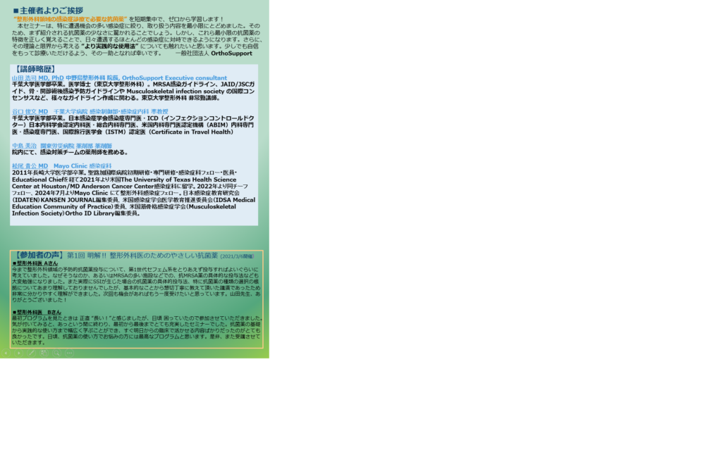 本セミナーは、特に遭遇機会の多い感染症に絞り、取り扱う内容を最小限にとどめました。そのため、まず紹介される抗菌薬の少なさに驚かれることでしょう。しかし、これら最小限の抗菌薬の特徴を正しく覚えることで、日々遭遇するほとんどの感染症に対峙できるようになります。さらに、その理論と限界から考える “より実践的な使用法” についても触れたいと思います。少しでも自信をもって診療いただけるよう、その一助となれば幸いです。 一般社団法人 OrthoSupport